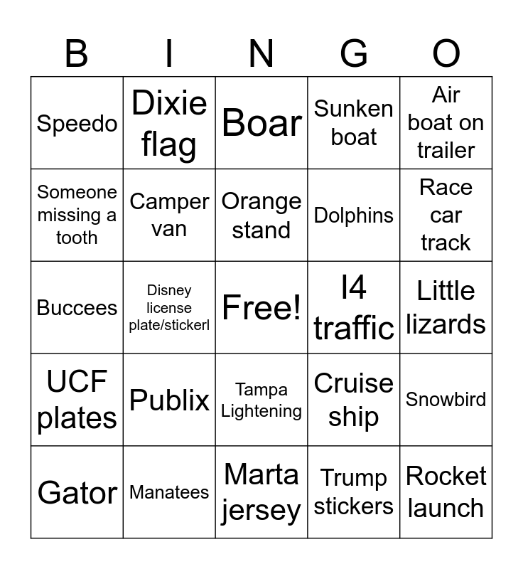 This bingo card has a free space and 24 words: Gator, Publix, Orange stand, Trump stickers, Air boat on trailer, Speedo, Dixie flag, Boar, I4 traffic, Little lizards, Buccees, Camper van, Cruise ship, Snowbird, Someone missing a tooth, Manatees, Marta jersey, Sunken boat, Race car track, UCF plates, Disney license plate/stickerl, Tampa Lightening, Dolphins and Rocket launch.