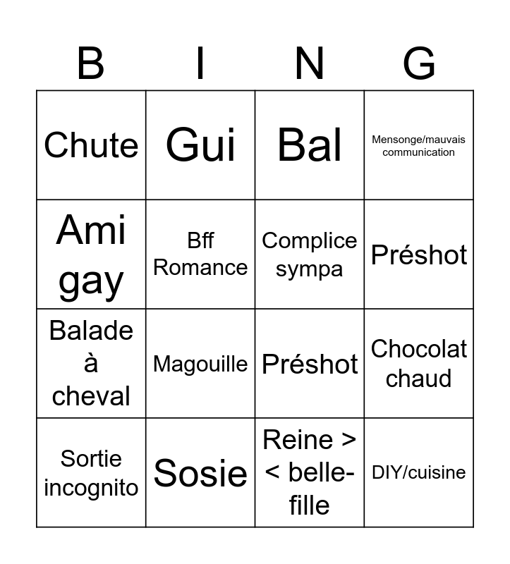 This bingo card has 16 words: Sosie, Chocolat chaud, Bal, Chute, Balade à cheval, Gui, Préshot, Reine >< belle-fille, Ami gay, Bff Romance, Sortie incognito, Mensonge/mauvais communication, Magouille, Préshot, Complice sympa and DIY/cuisine.