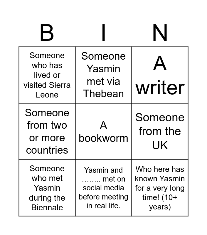 This bingo card has a free space and 8 words: Someone from the UK, A writer, Someone Yasmin met via Thebean, Someone who met Yasmin during the Biennale, Someone who has lived or visited Sierra Leone, Who here has known Yasmin for a very long time! (10+ years), Someone from two or more countries and Yasmin and …….. met on social media before meeting in real life..