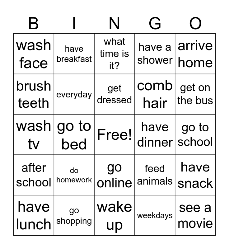 This bingo card has a free space and 25 words: do homework, wake up, get dressed, have lunch, arrive home, wash face, brush teeth, have breakfast, have dinner, go online, comb hair, wash tv, feed animals, have snack, everyday, daily routine, go to school, what time is it?, get on the bus, go to bed, see a movie, go shopping, after school, have a shower and weekdays.