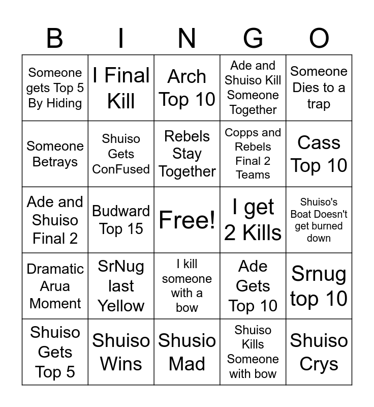 This bingo card has a free space and 24 words: SrNug last Yellow, Shuiso Wins, Rebels Stay Together, Shuiso Gets Top 5, Someone Dies to a trap, Someone gets Top 5 By Hiding, Someone Betrays, I Final Kill, I get 2 Kills, I kill someone with a bow, Copps and Rebels Final 2 Teams, Ade and Shuiso Final 2, Ade Gets Top 10, Srnug top 10, Shuiso Gets ConFused, Shuiso Kills Someone with bow, Shuiso's Boat Doesn't get burned down, Arch Top 10, Cass Top 10, Budward Top 15, Shuiso Crys, Dramatic Arua Moment, Ade and Shuiso Kill Someone Together and Shusio Mad.