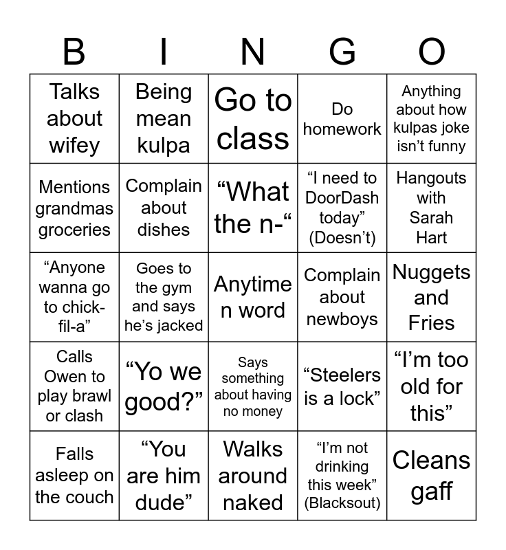 This bingo card has a free space and 24 words: “Yo we good?”, “You are him dude”, “What the n-“, Falls asleep on the couch, Anything about how kulpas joke isn’t funny, Talks about wifey, Mentions grandmas groceries, Being mean kulpa, Complain about newboys, Says something about having no money, “I need to DoorDash today” (Doesn’t), “Anyone wanna go to chick-fil-a”, “Steelers is a lock”, “I’m too old for this”, Complain about dishes, “I’m not drinking this week” (Blacksout), Nuggets and Fries, Go to class, Hangouts with Sarah Hart, Goes to the gym and says he’s jacked, Cleans gaff, Calls Owen to play brawl or clash, Do homework and Walks around naked.