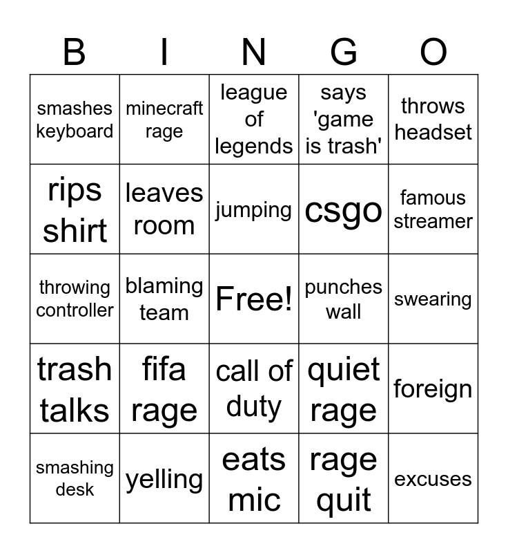 This bingo card has a free space and 24 words: fifa rage, yelling, jumping, smashing desk, throws headset, smashes keyboard, rips shirt, minecraft rage, punches wall, call of duty, csgo, throwing controller, quiet rage, foreign, leaves room, rage quit, swearing, league of legends, famous streamer, blaming team, excuses, trash talks, says 'game is trash' and eats mic.