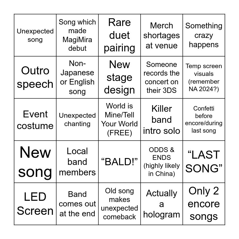 This bingo card has a free space and 24 words: LED Screen, Local band members, New stage design, Actually a hologram, Something crazy happens, Unexpected song, Song which made MagiMira debut, Rare duet pairing, Killer band intro solo, Confetti before encore/during last song, Event costume, Non-Japanese or English song, ODDS & ENDS (highly likely in China), “LAST SONG”, Outro speech, Band comes out at the end, Old song makes unexpected comeback, Merch shortages at venue, Temp screen visuals (remember NA 2024?), New song, Unexpected chanting, “BALD!”, Someone records the concert on their 3DS and Only 2 encore songs.