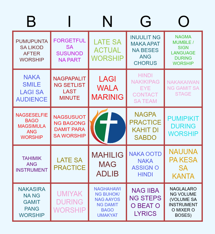 This bingo card has a free space and 24 words: LATE SA PRACTICE, UMIYAK DURING WORSHIP, LAGI WALA MARINIG, NAKASIRA NA NG GAMIT PANG WORSHIP, NAGMA MUMBLE / SIGN LANGUAGE DURING WORSHIP, PUMUPUNTA SA LIKOD AFTER WORSHIP, NAKA SMILE LAGI SA AUDIENCE, FORGETFUL SA SUSUNOD NA PART, NAGPA PRACTICE KAHIT DI SABDO, MAHILIG MAG ADLIB, HINDI NAKIKIPAG EYE CONTACT SA TEAM, NAGSESELFIE BAGO MAGSIMULA ANG WORSHIP, NAKA OOTD NAKA ASSIGN O HINDI, NAUUNA PA KESA SA KANTA, NAGPAPALIT NG SETLIST LAST MINUTE, NAG IIBA NG STEPS O BEAT O LYRICS, PUMIPIKIT DURING WORSHIP, LATE SA ACTUAL WORSHIP, NAKAKAIWAN NG GAMIT SA STAGE, NAGSUSUOT NG BAGONG DAMIT PARA SA WORSHIP, NAGLALARO NG VOLUME (VOLUME SA INSTRUMENT O MIXER O BOSES), TAHIMIK ANG INSTRUMENT, INUULIT NG MAKA APAT NA BESES ANG CHORUS and NAGHAHAWI NG BUHOK/ NAG AAYOS NG DAMIT BAGO UMAKYAT.