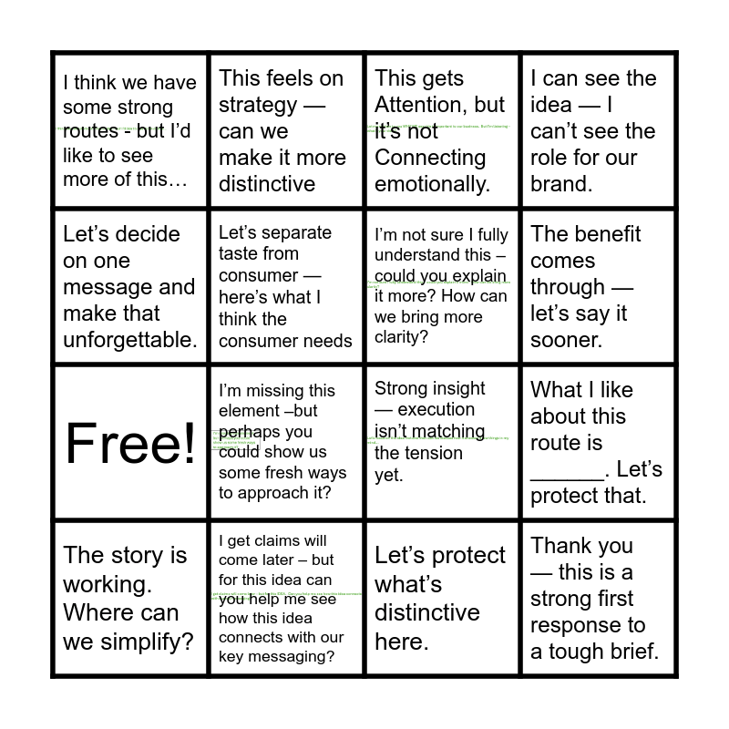 This bingo card has 8 images and 20 words: What I like about this route is ______. Let’s protect that., This is brave. Let’s test it, not kill it., This gets Attention, but it’s not Connecting emotionally., Feedback from Stakeholder was x… How can we work on this to resolve it together?, The story is working. Where can we simplify?, Let’s decide on one message and make that unforgettable., I get claims will come later – but for this idea can you help me see how this idea connects with our key messaging?, I think we have some strong routes - but I’d like to see more of this…, Free!, This feels on strategy — can we make it more distinctive, I’m missing this element –but perhaps you could show us some fresh ways to approach it?, Strong insight — execution isn’t matching the tension yet., Let’s separate taste from consumer — here’s what I think the consumer needs, Thank you — this is a strong first response to a tough brief., I’m not sure I fully understand this – could you explain it more? How can we bring more clarity?, I’m not feeling as engaged with this one. Is there a way to dial that up?, The benefit comes through — let’s say it sooner., I can see the idea — I can’t see the role for our brand., Let’s protect what’s distinctive here. and Good, but too many messages for 30 seconds..