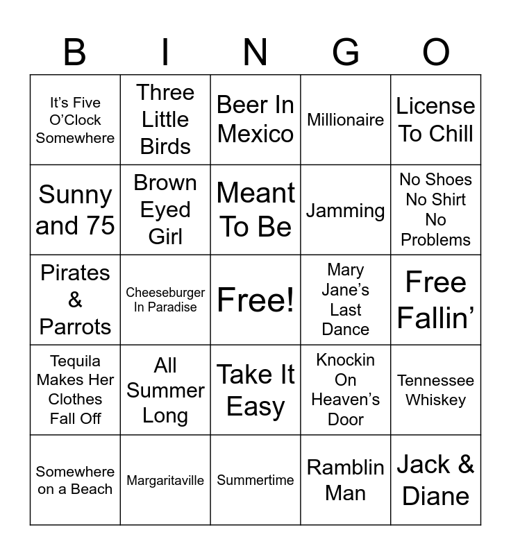 This bingo card has a free space and 30 words: Margaritaville, Knee Deep, Cheeseburger In Paradise, Toes, It’s Five O’Clock Somewhere, Beer In Mexico, Brown Eyed Girl, Take It Easy, Mary Jane’s Last Dance, Summertime, Free Fallin’, Jack & Diane, Ramblin Man, The Joker, No Shoes No Shirt No Problems, Friends In Low Places, Knockin On Heaven’s Door, Tequila Makes Her Clothes Fall Off, All Summer Long, License To Chill, Pirates & Parrots, Fire and Rain, Three Little Birds, Jamming, Sunny and 75, Millionaire, Tennessee Whiskey, Somewhere on a Beach, Meant To Be and Cruise.