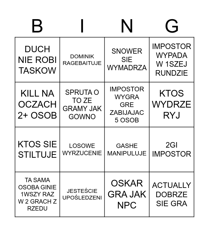 This bingo card has 16 words: JESTEŚCIE UPOŚLEDZENI, 2GI IMPOSTOR, SNOWER SIE WYMADRZA, DUCH NIE ROBI TASKOW, KTOS SIE STILTUJE, DOMINIK RAGEBAITUJE, GASHE MANIPULUJE, OSKAR GRA JAK NPC, KILL NA OCZACH 2+ OSOB, SPRUTA O TO ZE GRAMY JAK GOWNO, TA SAMA OSOBA GINIE 1WSZY RAZ W 2 GRACH Z RZEDU, IMPOSTOR WYPADA W 1SZEJ RUNDZIE, LOSOWE WYRZUCENIE, KTOS WYDRZE RYJ, IMPOSTOR WYGRA GRE ZABIJAJAC 5 OSOB and ACTUALLY DOBRZE SIE GRA.