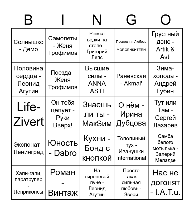 This bingo card has 35 words: Силуэт - Ваня Дмитриенко, Аня Пересильд, ИСКАЛА - Земфира, ТОПИМ - BEARWOLF, Поезда - Женя Трофимов, Кухни - Бонд с кнопкой, Последняя Любовь - MORGENSHTERN, Половина сердца - Леонид Агутин, Эта любовь - Amirchik, Высшие силы - ANNA ASTI, Капкан - MOT, Life- Zivert, Грустный дэнс - Artik & Asti, Текила-любовь - Валерий Меладзе, Вне зоны доступа - Город 312, Солнышко - Демо, О нём - Ирина Дубцова, Просто такая сильная любовь - Звери, Он тебя целует - Руки Вверх!, Экспонат - Ленинград, Знаешь ли ты - МакSим, Тополиный пух - Иванушки International, Хали-гали, паратрупер - Леприконсы, Самба белого мотылька - Валерий Меладзе, Роман - Винтаж, Рюмка водки на столе - Григорий Лепс, Зима-холода - Андрей Губин, Нас не догонят - t.A.T.u., В сердце бахнули стрелы- Тося Чайкина, Раневская - Akmal', Тут или Там - Сергей Лазарев, Невеста? - Мумий Тролль, На сиреневой луне - Леонид Агутин, Юность - Dabro, Самолеты - Женя Трофимов and Шёлк - Ваня Дмитриенко.