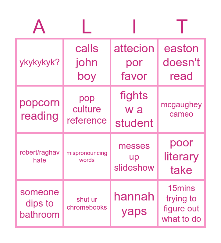 This bingo card has 16 words: shut ur chromebooks, poor literary take, attecion por favor, ykykykyk?, robert/raghav hate, calls john boy, messes up slideshow, hannah yaps, popcorn reading, pop culture reference, someone dips to bathroom, easton doesn't read, mispronouncing words, mcgaughey cameo, fights w a student and 15mins trying to figure out what to do.