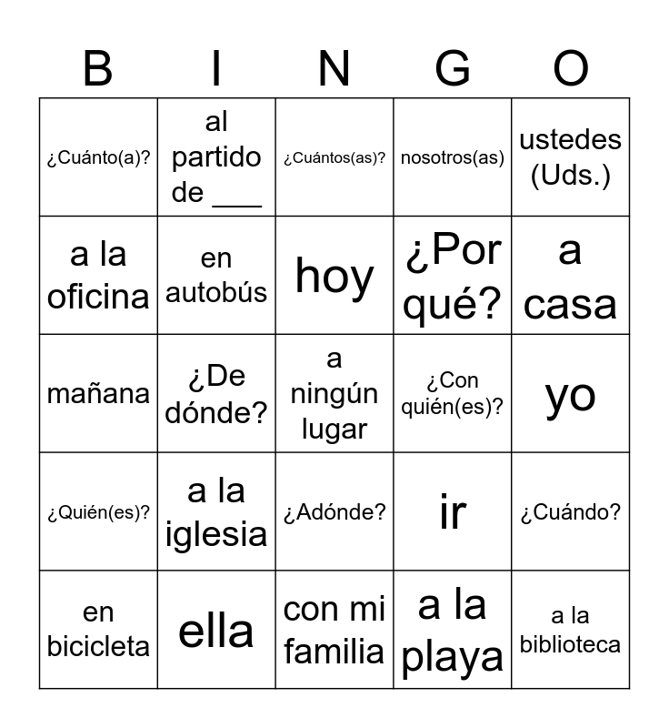 This bingo card has 70 words: ¡LIBRE!, yo, tú, él, ella, usted (Ud.), nosotros(as), ellos / ellas, ustedes (Uds.), ¿Cómo?, ¿Cuándo?, ¿Cuál(es)?, ¿Cuánto(a)?, ¿Cuántos(as)?, ¿Dónde?, ¿De dónde?, ¿Adónde?, ¿Por qué?, ¿Qué?, ¿Quién(es)?, ¿Con quién(es)?, ir, a casa, a la casa de ___, a la escuela / al colegio, al cine, al parque, a la piscina, a la playa, al centro comercial, al partido de ___, al trabajo, a la tienda, al supermercado, a una fiesta, a comer, a un restaurante, al doctor, a la dentista, a la oficina, a la biblioteca, a la iglesia, a ningún lugar, en carro / coche, en avión, en autobús, en bicicleta, en taxi, en barco, en tren, en metro, a pie, a caballo, con mi(s) amigo(s), con mi familia, solo(a), hoy, esta mañana, esta tarde, esta noche, mañana, el lunes, el martes, el miércoles, el jueves, el viernes, el sábado, el domingo, el fin de semana and todos los días.