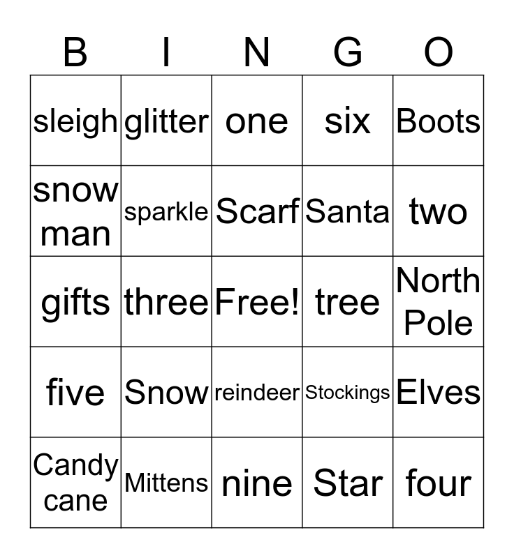 This bingo card has a free space and 24 words: Snow, Mittens, Scarf, Candy cane, Boots, sleigh, snow man, glitter, tree, reindeer, Santa, gifts, Stockings, Elves, sparkle, Star, North Pole, one, two, three, four, five, six and nine.