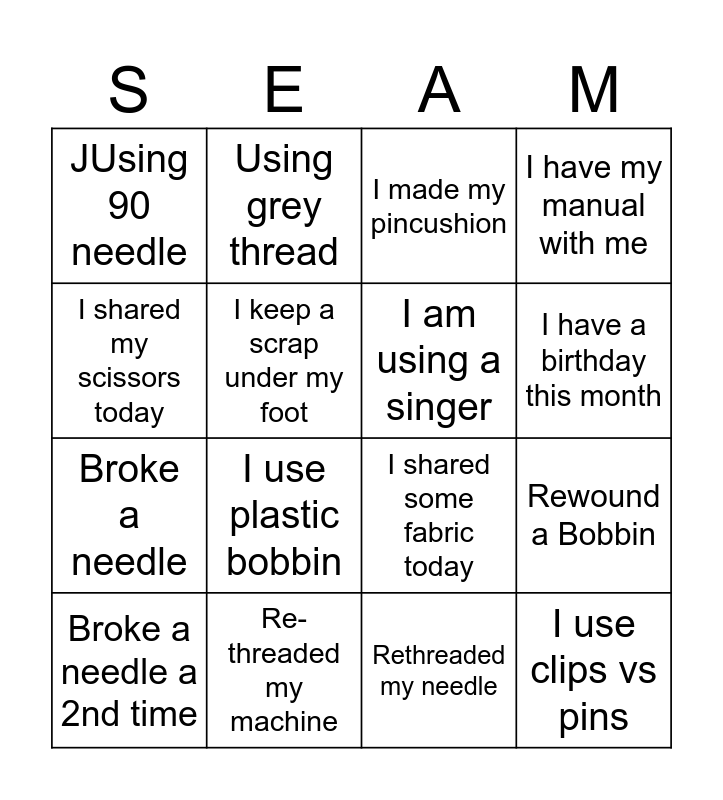 This bingo card has 28 words: Using a 90 needle, Brought my own water, Broke a needle, Rewound a bobbin, I keep a scrap under my foot, I made my pincushion, Using grey thread, I use clips vs pins, Re-threaded my machine, I use a metal bobbin, I shared some fabric today, I have my manual with me, I am hand-sewing today, I forgot something when packing, I use plastic bobbin, I brought my own extension cord, I used an iron today, I am using a singer, I have a birthday this month, I brought a friend, JUsing 90 needle, Use a rolling machine cart, Broke a needle a 2nd time, Rewound a Bobbin, Rethreaded my needle, I shared some fabric today, I shared my scissors today and I borrowed a sew tool.