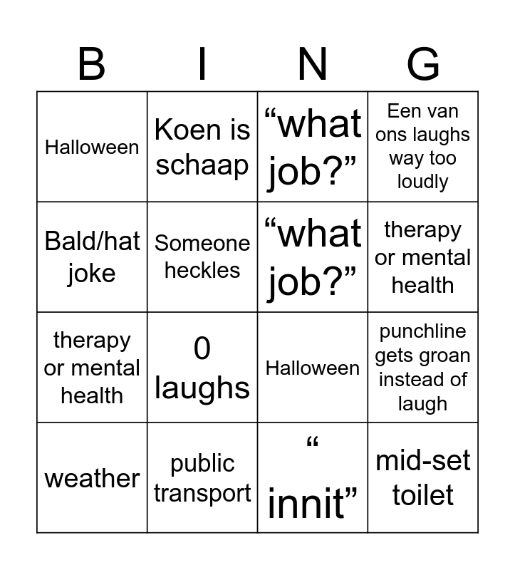 This bingo card has 40 words: Brexit, Halloween, ”Where you from?”, “what job?”, Crowd: relationship?, dating apps, therapy or mental health, Someone heckles, Bald/hat joke, mid-set toilet, punchline gets groan instead of laugh, Een van ons laughs way too loudly, weather, “ innit”, public transport, trump, Brexit, Halloween, ”Where you from?”, “what job?”, Crowd: relationship?, dating apps, therapy or mental health, Someone heckles, Bald/hat joke, mid-set toilet, punchline gets groan instead of laugh, Een van ons laughs way too loudly, weather, “ innit”, public transport, trump, football, alcohol/drugs, 0 laughs, Ph mist clue, Bart limbo laugh, Mattie gaapt, Koen is schaap and Bas mentions blend Viet.