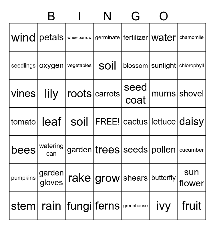This bingo card has a free space and 51 words: stem, sunlight, sprout, leaf, roots, seeds, petals, greenhouse, water, pollen, chamomile, germinate, mums, seed coat, grow, bees, seedlings, chlorophyll, rain, fertilizer, blossom, soil, wind, oxygen, fungi, fruit, vegetables, ferns, shovel, wheelbarrow, plant pot, watering can, rake, shears, trees, tomato, lettuce, cucumber, pumpkins, garden gloves, vines, lily, butterfly, ivy, cactus, daisy, soil, garden, sun flower, carrots and rain.