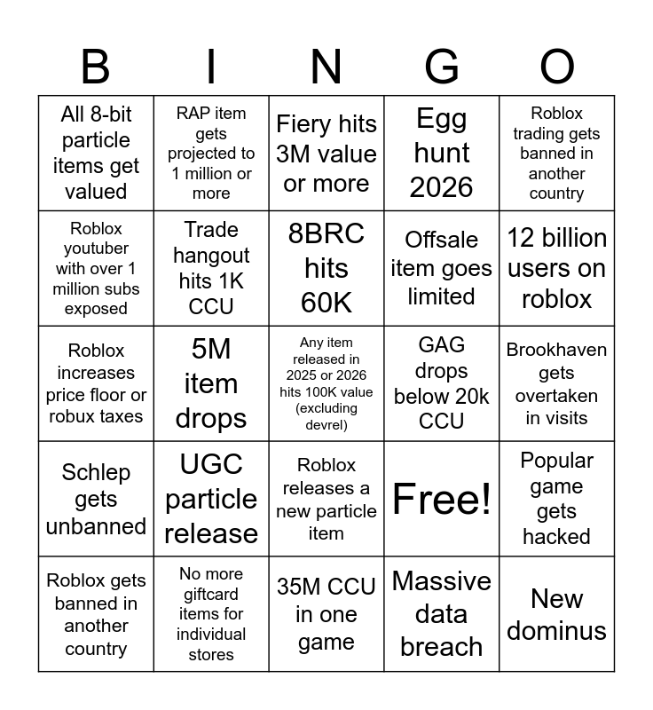 This bingo card has 25 words: UGC particle release, 35M CCU in one game, 8BRC hits 60K, Roblox gets banned in another country, Roblox trading gets banned in another country, All 8-bit particle items get valued, Roblox youtuber with over 1 million subs exposed, RAP item gets projected to 1 million or more, GAG drops below 20k CCU, Roblox releases a new particle item, Offsale item goes limited, Roblox increases price floor or robux taxes, Free!, Popular game gets hacked, Trade hangout hits 1K CCU, New dominus, Brookhaven gets overtaken in visits, Fiery hits 3M value or more, 12 billion users on roblox, 5M item drops, Any item released in 2025 or 2026 hits 100K value (excluding devrel), No more giftcard items for individual stores, Schlep gets unbanned, Egg hunt 2026 and Massive data breach.