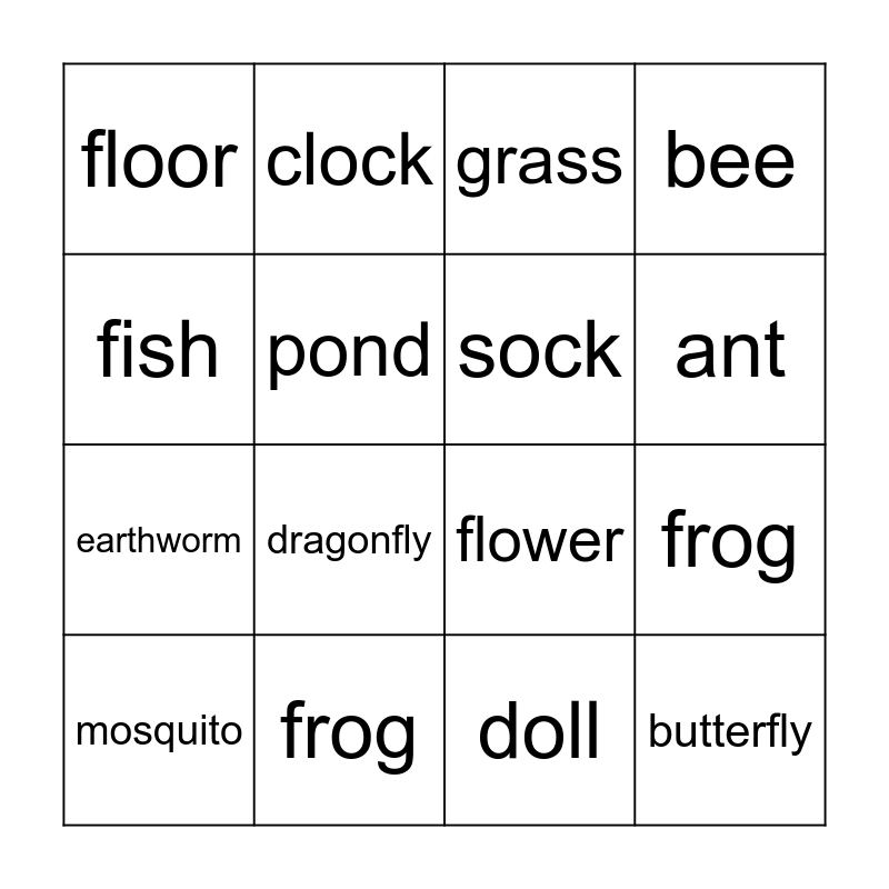 This bingo card has 21 words: frog, rock, clock, pot, doll, sock, floor, grass, flower, ant, earthworm, bee, butterfly, tail, pond, water lily, mosquito, dragonfly, fish, frog and tadpol.