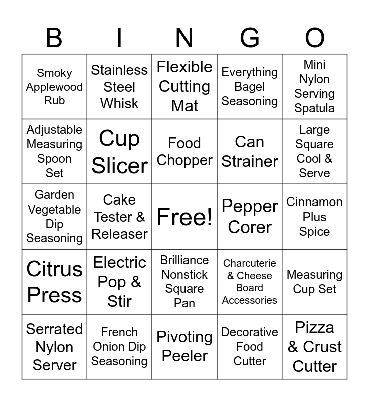 This bingo card has a free space and 66 words: Mix 'N Scraper, Plastic Mixing Bowl, Measure-All Cup, Measuring Cup Set, Batter Bowl, Smooth Edge Can Opener, Stainless Steel Whisk, Glass Prep Bowl, Food Chopper, Easy-Read Measuring Cup Set, Brilliance Nonstick Square Pan, Twizit Clip Set, Cinnamon Plus Spice, Mini Nylon Serving Spatula, Whipped Cream Maker & Decorator, Adjustable Measuring Spoon Set, Cake Tester & Releaser, Smoky Applewood Rub, Honey Sriracha Seasoning, Can Strainer, Electric Pop & Stir, Citrus Press, Everything Bagel Seasoning, Apple Corer, Garlic Press, Citrus Juicer & Zester, Adjustable Course Grater, Pizza Stone, Pizza & Crust Cutter, Large Stainless Steel Scoop, Serrated Nylon Server, Nesting Silicone Trivets, Multi-Purpose Silicone Mats, Dual-Sided Charcuterie Board Set, Charcuterie & Cheese Board Accessories, French Onion Dip Seasoning, Creamy Jalapeno Seasoning, Garden Vegetable Dip Seasoning, Decorative Food Cutter, Rapid Prep Mandoline, Cup Slicer, Anniversary Collection Pottery, Pepper Corer, Mini Counter Vacuum, Anniversary Scraper, Stainless Steel Rotating Utensil Holder, Large Square Cool & Serve, Kid's Club, Coating Trays & Tongs, All Purpose Spreader, Stainless Steel Egg Separator, Silicone Prep Bowl Set, Baker's Roller, Chef's Silicone Basting Brush, Hand Pie & Pocket Maker, Pastry Mat, Coated Chef's Knife, Kitchen Pairing Knife, Flexible Cutting Mat, Pivoting Peeler, Powdered Sugar Shaker, Holiday Mini Mitten Tongs, Hot Chocolate Gift Set, Homemade Dog Treat Gift Set, Gingerbread Bake & Build Box and Dipping Oil Sampler Set.