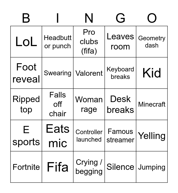 This bingo card has a free space and 24 words: Eats mic, Fifa, Valorent, Fortnite, Geometry dash, LoL, Foot reveal, Headbutt or punch, Desk breaks, Controller launched, Keyboard breaks, Ripped top, Famous streamer, Yelling, Swearing, Silence, Minecraft, Pro clubs (fifa), Kid, Falls off chair, Jumping, E sports, Leaves room and Crying / begging.