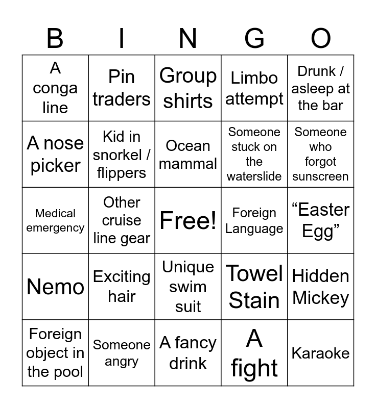 This bingo card has a free space and 24 words: Exciting hair, Someone angry, Ocean mammal, Foreign object in the pool, Drunk / asleep at the bar, A conga line, A nose picker, Pin traders, Foreign Language, Unique swim suit, Someone stuck on the waterslide, Medical emergency, Towel Stain, Hidden Mickey, Kid in snorkel / flippers, A fight, “Easter Egg”, Group shirts, Someone who forgot sunscreen, Other cruise line gear, Karaoke, Nemo, Limbo attempt and A fancy drink.