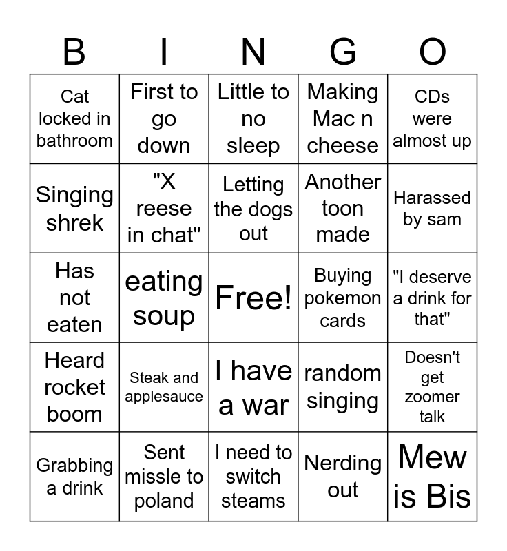 This bingo card has a free space and 24 words: Grabbing a drink, Steak and applesauce, Letting the dogs out, Nerding out, CDs were almost up, Cat locked in bathroom, First to go down, Little to no sleep, Buying pokemon cards, "I deserve a drink for that", Has not eaten, "X reese in chat", random singing, Doesn't get zoomer talk, Singing shrek, Sent missle to poland, I need to switch steams, Making Mac n cheese, Harassed by sam, Heard rocket boom, eating soup, I have a war, Another toon made and Mew is Bis.