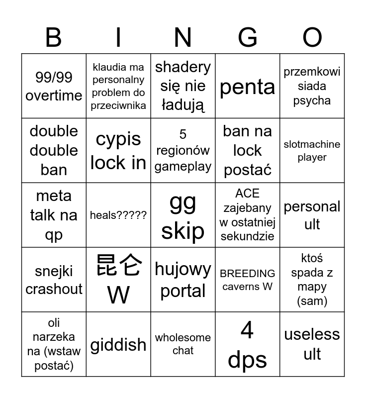 This bingo card has a free space and 34 words: Celestial w enemy, 4 dps, <1 kd lord, gg ez na chacie, snejki crashout, cypis lock in, przemkowi siada psycha, oli narzeka na (wstaw postać), klaudia ma personalny problem do przeciwnika, 0 teamup, 5 regionów gameplay, shadery się nie ładują, 5+ lose streak, coping, ACE zajebany w ostatniej sekundzie, slotmachine player, giddish, meta talk na qp, 昆仑 W, BREEDING caverns W, hujowy portal, double supp ult, 99/99 overtime, personal ult, wholesome chat, useless ult, penta, afk in spawn, ban na lock postać, double double ban, konwój 1min+ zapasu, heals?????, ktoś spada z mapy (sam) and portal się zamyka na mordzie.