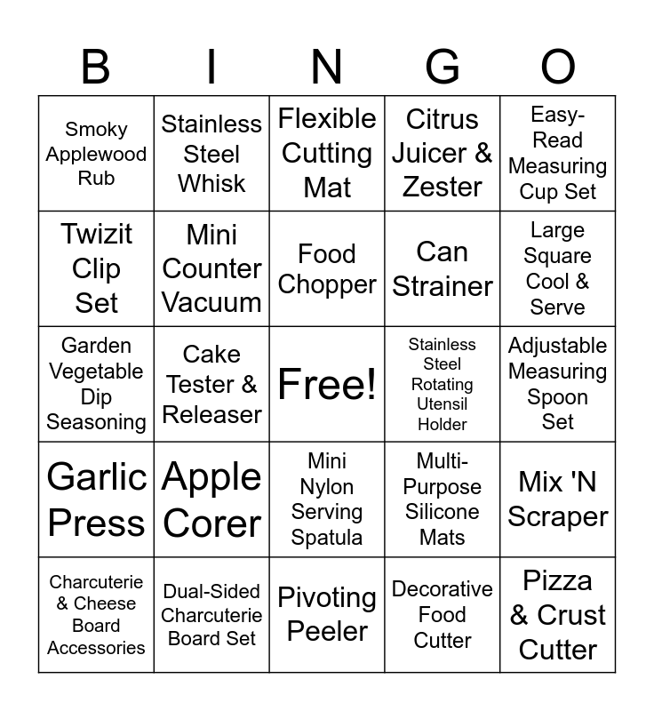 This bingo card has a free space and 66 words: Measuring Cup Set, Batter Bowl, Smooth Edge Can Opener, Mix 'N Scraper, Plastic Mixing Bowl, Measure-All Cup, Stainless Steel Whisk, Glass Prep Bowl, Food Chopper, Cinnamon Plus Spice, Mini Nylon Serving Spatula, Whipped Cream Maker & Decorator, Adjustable Measuring Spoon Set, Easy-Read Measuring Cup Set, Brilliance Nonstick Square Pan, Twizit Clip Set, Cake Tester & Releaser, Smoky Applewood Rub, Honey Sriracha Seasoning, Can Strainer, Apple Corer, Garlic Press, Citrus Juicer & Zester, Adjustable Course Grater, Electric Pop & Stir, Citrus Press, Everything Bagel Seasoning, Pizza Stone, Pizza & Crust Cutter, Large Stainless Steel Scoop, Charcuterie & Cheese Board Accessories, French Onion Dip Seasoning, Serrated Nylon Server, Nesting Silicone Trivets, Multi-Purpose Silicone Mats, Dual-Sided Charcuterie Board Set, Creamy Jalapeno Seasoning, Garden Vegetable Dip Seasoning, Decorative Food Cutter, Pepper Corer, Mini Counter Vacuum, Anniversary Scraper, Stainless Steel Rotating Utensil Holder, Rapid Prep Mandoline, Cup Slicer, Anniversary Collection Pottery, Large Square Cool & Serve, Kid's Club, Coating Trays & Tongs, Chef's Silicone Basting Brush, Hand Pie & Pocket Maker, Pastry Mat, Coated Chef's Knife, All Purpose Spreader, Stainless Steel Egg Separator, Silicone Prep Bowl Set, Baker's Roller, Kitchen Pairing Knife, Flexible Cutting Mat, Pivoting Peeler, Homemade Dog Treat Gift Set, Gingerbread Bake & Build Box, Dipping Oil Sampler Set, Powdered Sugar Shaker, Holiday Mini Mitten Tongs and Hot Chocolate Gift Set.