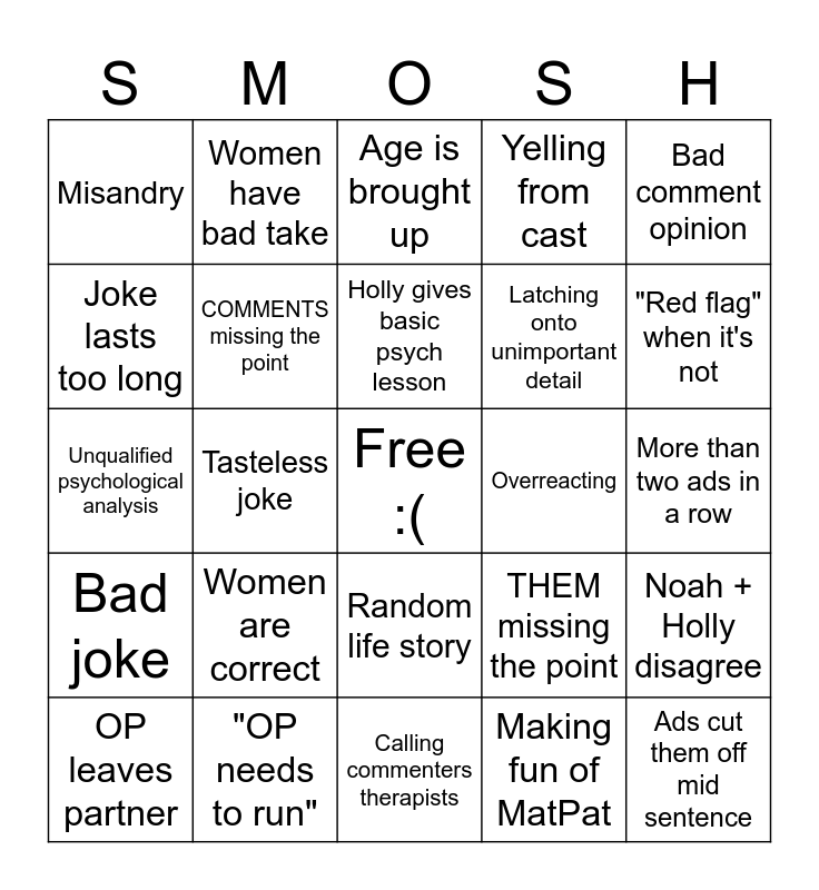 This bingo card has a free space and 31 words: Calling commenters therapists, Changing opinion, Tasteless joke, Reasonable opinion, Misandry, Age is brought up, COMMENTS missing the point, THEM missing the point, Overreacting, Making fun of MatPat, More than two ads in a row, Ads cut them off mid sentence, Something makes us audibly yell, Bad pop culture reference, "Red flag" when it's not, Absence of red flag, Noah + Holly disagree, Women are correct, Bad joke, Random life story, Bad comment opinion, Worse than we think, OP leaves partner, Women have bad take, Latching onto unimportant detail, Joke lasts too long, Yelling from cast, Unqualified psychological analysis, "OP needs to run", Holly gives basic psych lesson and Putting themselves in OP's shoes.