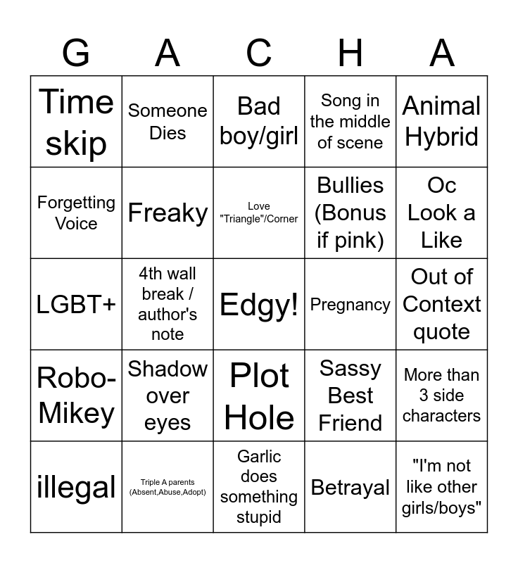 This bingo card has a free space and 24 words: Shadow over eyes, Triple A parents (Absent,Abuse,Adopt), Love "Triangle"/Corner, illegal, Animal Hybrid, Time skip, Forgetting Voice, Someone Dies, Pregnancy, Plot Hole, Bullies (Bonus if pink), LGBT+, Sassy Best Friend, More than 3 side characters, Freaky, Betrayal, Out of Context quote, Bad boy/girl, Oc Look a Like, 4th wall break / author's note, "I'm not like other girls/boys", Robo-Mikey, Song in the middle of scene and Garlic does something stupid.