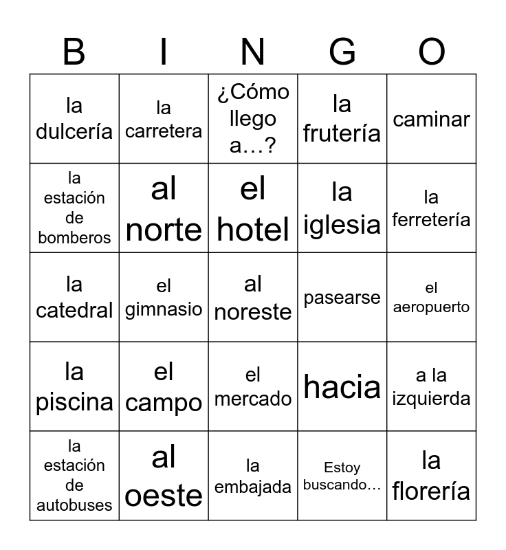 This bingo card has 98 words: ¡LIBRE!, el destino, la acera, el aeropuerto, el acuario, el almacén, el apartamento, la avenida, el ayuntamiento, el banco, la biblioteca, el café, la calle, el campo, la carnicería, la carretera, la catedral, el cementerio, el centro comercial, el centro recreativo, el cine, la clínica, la cuadra, el cruce, la dirección, la dulcería, la embajada, la esquina, la estación de tren, la estación de metro, la estación de autobuses, la estación de bomberos, la fábrica, la farmacía, la ferretería, la florería, la frutería, la gasolinera, el gimnasio, la heladería, el hospital, el hotel, la iglesia, la librería, el lugar, el mercado, el monumento, la mueblería, el museo, el negocio, la oficina de correos, la panadería, la papelería, el parque, el parque de diversiones, el parque infantil, la piscina, la peluquería, el puente, el policía, la plaza, el restaurante, el semáforo, el supermercado, el taller, la tienda de comestibles, la torre, la zapatería, el zoológico (el zoo), Disculpe…, ¿Cómo llego a…?, ¿Dónde podría (inf)?, Estoy buscando…, ¿Me puede decir dónde hay…, ¿Sabe usted dónde está…?, No sé., Tiene que…, Gracias por la ayuda., al este, al noreste, al noroeste, al norte, al oeste, al sur, al sureste, al suroeste, doblar, a la derecha, a la izquierda, adelante, seguir (e:i) derecho, hacia, todo recto, parar, pasearse, perderse, caminar and salir de.