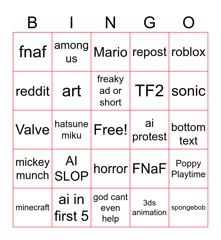 This bingo card has a free space and 24 words: AI SLOP, ai in first 5, freaky ad or short, minecraft, roblox, fnaf, reddit, among us, ai protest, horror, TF2, Valve, FNaF, Poppy Playtime, art, 3ds animation, bottom text, Mario, sonic, hatsune miku, spongebob, mickey munch, repost and god cant even help.