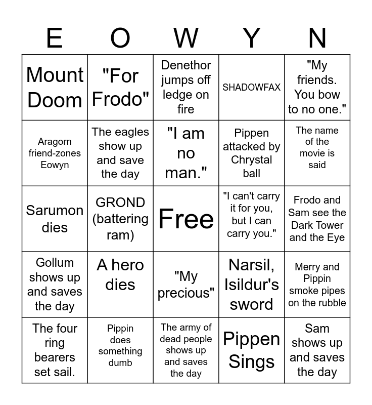 This bingo card has a free space and 24 words: A hero dies, Pippin does something dumb, "I am no man.", The four ring bearers set sail., "My friends. You bow to no one.", Mount Doom, Aragorn friend-zones Eowyn, "For Frodo", "I can't carry it for you, but I can carry you.", "My precious", Pippen attacked by Chrystal ball, Sarumon dies, Narsil, Isildur's sword, Merry and Pippin smoke pipes on the rubble, The eagles show up and save the day, Pippen Sings, Frodo and Sam see the Dark Tower and the Eye, Denethor jumps off ledge on fire, The name of the movie is said, GROND (battering ram), Sam shows up and saves the day, Gollum shows up and saves the day, SHADOWFAX and The army of dead people shows up and saves the day.