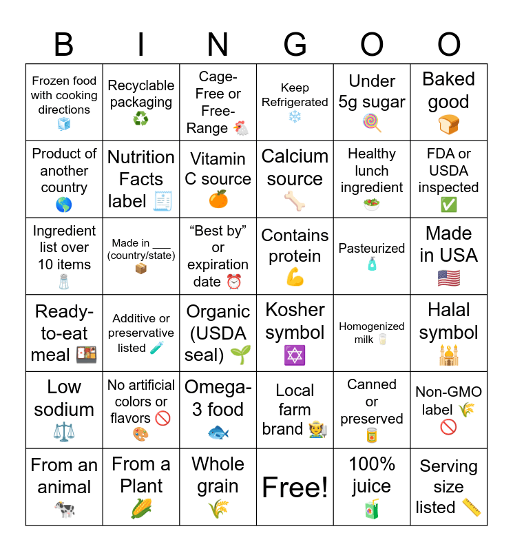 This bingo card has 39 words: From a Plant π½, From an animal π, Grown locally π, Product of another country π, Organic (USDA seal) π±, Made in USA πΊπΈ, Nutrition Facts label π§Ύ, Serving size listed π, Under 5g sugar π, Contains protein πͺ, FDA or USDA inspected β , Keep Refrigerated βοΈ, Ingredient list over 10 items π§, βBest byβ or expiration date β°, Made in ___ (country/state) π¦, Pasteurized π§΄, Canned or preserved π₯«, Frozen food with cooking directions π§, Whole grain πΎ, Ready-to-eat meal π±, Baked good π, Homogenized milk π₯, Vitamin C source π, Calcium source π¦΄, Free!, Omega-3 food π, Low sodium βοΈ, 100% juice π§, No artificial colors or flavors π«π¨, Recyclable packaging β»οΈ, Fair Trade certified π€, Non-GMO label πΎπ«, Cage-Free or Free-Range π, Kosher symbol β‘οΈ, Halal symbol π, Local farm brand π§βπΎ, Additive or preservative listed π§ͺ, Healthy lunch ingredient π₯ and Perishable item sticker π§.