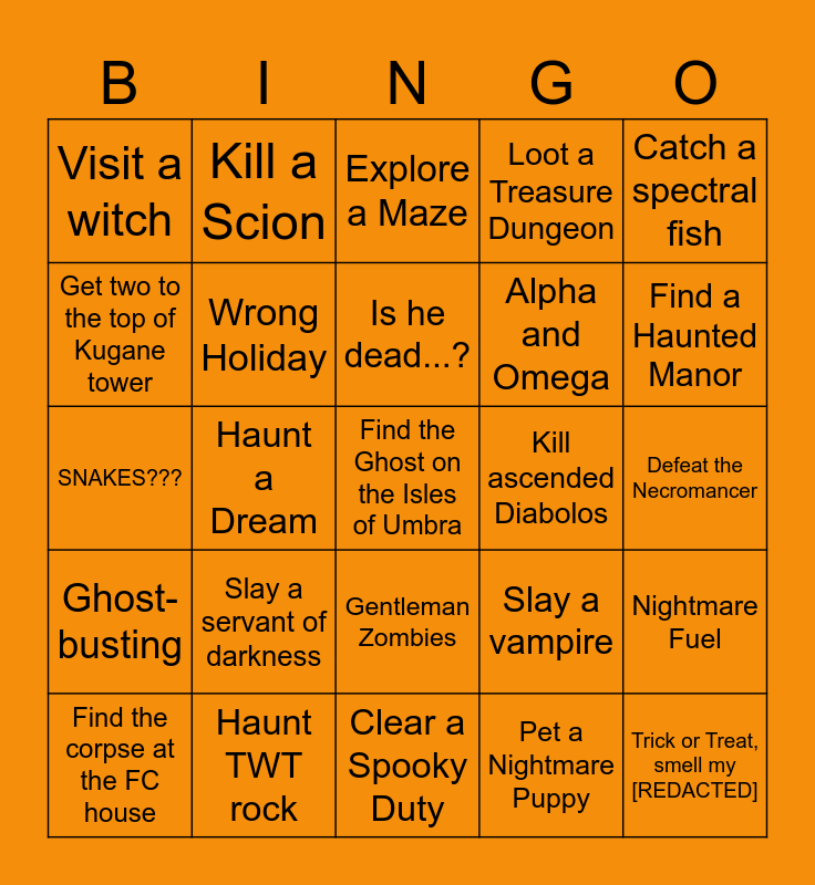 This bingo card has a free space and 24 words: Slay a servant of darkness, Haunt TWT rock, Is he dead...?, Find the corpse at the FC house, Catch a spectral fish, Visit a witch, Get two to the top of Kugane tower, Kill a Scion, Kill ascended Diabolos, Gentleman Zombies, Alpha and Omega, SNAKES???, Slay a vampire, Nightmare Fuel, Wrong Holiday, Pet a Nightmare Puppy, Defeat the Necromancer, Explore a Maze, Find a Haunted Manor, Haunt a Dream, Trick or Treat, smell my [REDACTED], Ghost-busting, Loot a Treasure Dungeon and Clear a Spooky Duty.