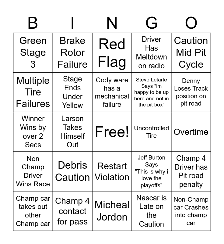This bingo card has a free space and 42 words: Kyle Busch gets a pit Road penalty, Cody ware has a mechanical failure, Something Breaks on dennys car, Debris Caution, Nascar is Late on the Caution, Champ 4 Driver has Pit road penalty, Non-Champ car Crashes into champ car, Blaney Blows a tire, Red Flag, Restart Violation, Overtime, Denny Loses Track position on pit road, Larson Takes Himself Out, Caution Mid Pit Cycle, Caution Hocevar, Jeff Burton Says "This is why i love the playoffs", Attempted Race Manipulation, Winner Wins by over 2 Secs, Joey has the Best Pace, Brake Rotor Failure, Multiple Tire Failures, Green Stage 1, Green Stage 2, Green Stage 3, Someone Takes 2 Tires, Non Champ Driver Wins a Stage, Steve Letarte Says "im happy to be up here and not in the pit box", NBC misses a Wreck, UI Glitch, Someone Runs out of Fuel, Engine Failure, Non Champ Driver Wins Race, Stage Ends Under Yellow, Micheal Jordon, Double Overtime over the rainbow, Champ car takes out other Champ car, Champ 4 contact for pass, Uncontrolled Tire, Loose Wheel on Track, 5 Wide, Driver Has Meltdown on radio and The Sucker Hole.
