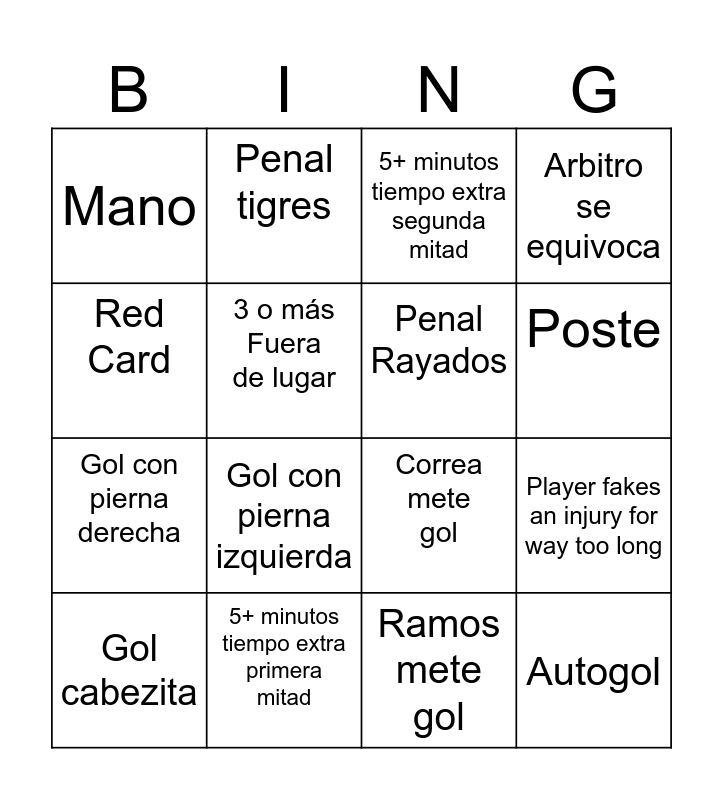 This bingo card has 24 words: Gol de Rayados, Gol de tigres, Poste, Yellow Card, Red Card, Mano, 3 o más Fuera de lugar, Penal tigres, 5+ minutos tiempo extra primera mitad, Berterame mete gol, Gol con pierna derecha, Correa mete gol, 4+ tiros de esquina, Gol de fuera del área, Penal Rayados, VAR check, Ramos mete gol, 5+ minutos tiempo extra segunda mitad, Gol con pierna izquierda, Player fakes an injury for way too long, Gol cabezita, Autogol, Arbitro se equivoca and Hacen un gol y lo quitan.