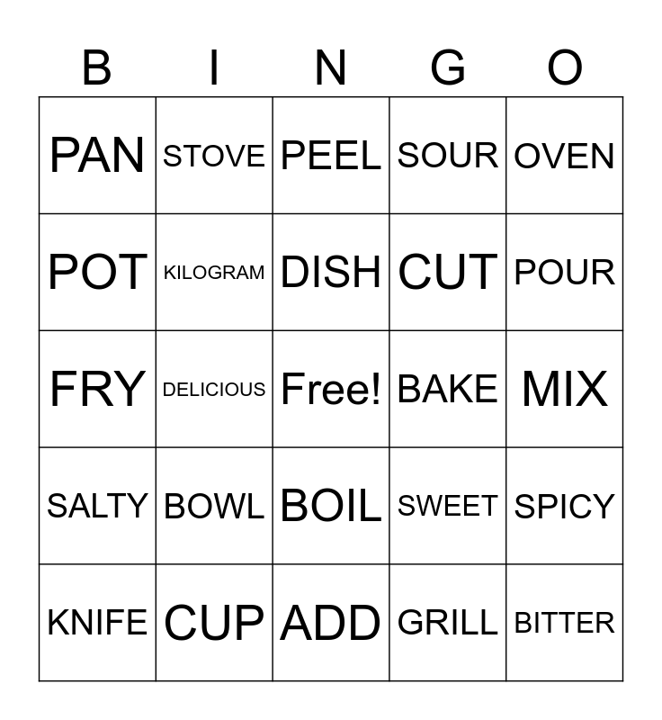 This bingo card has a free space and 24 words: BOWL, CUP, DISH, KNIFE, OVEN, PAN, POT, STOVE, BAKE, BOIL, CUT, FRY, SWEET, SPICY, KILOGRAM, GRILL, MIX, PEEL, POUR, DELICIOUS, BITTER, SALTY, SOUR and ADD.