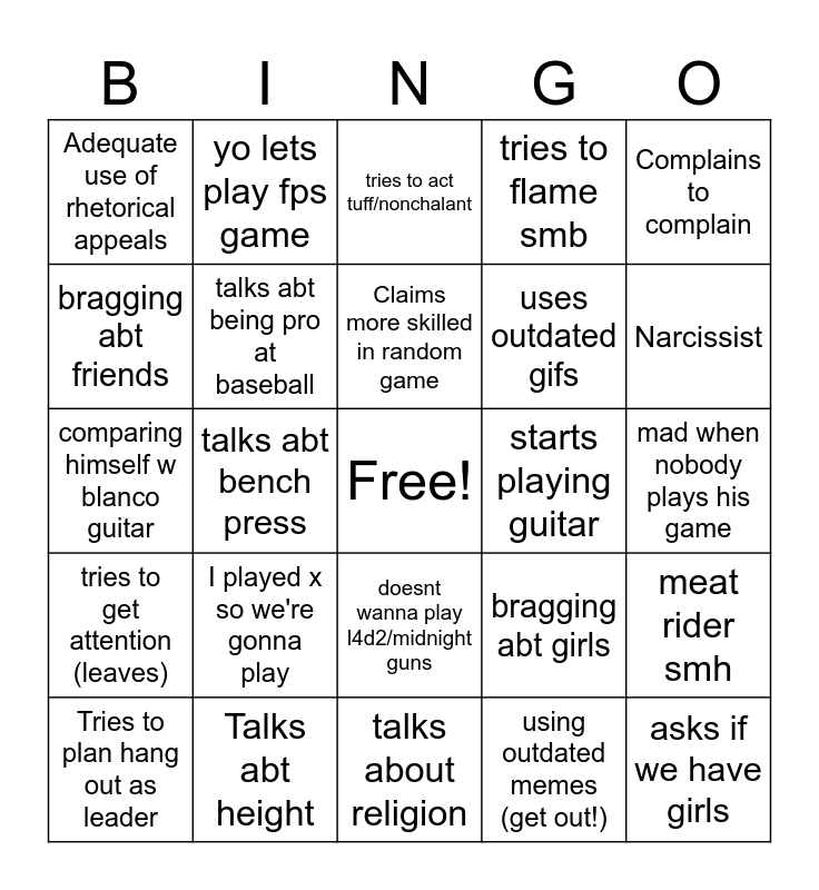 This bingo card has a free space and 24 words: I played x so we're gonna play, Talks abt height, Claims more skilled in random game, Tries to plan hang out as leader, Complains to complain, Adequate use of rhetorical appeals, bragging abt friends, yo lets play fps game, starts playing guitar, doesnt wanna play l4d2/midnight guns, uses outdated gifs, comparing himself w blanco guitar, bragging abt girls, meat rider smh, talks abt being pro at baseball, using outdated memes (get out!), mad when nobody plays his game, tries to act tuff/nonchalant, Narcissist, talks abt bench press, asks if we have girls, tries to get attention (leaves), tries to flame smb and talks about religion.