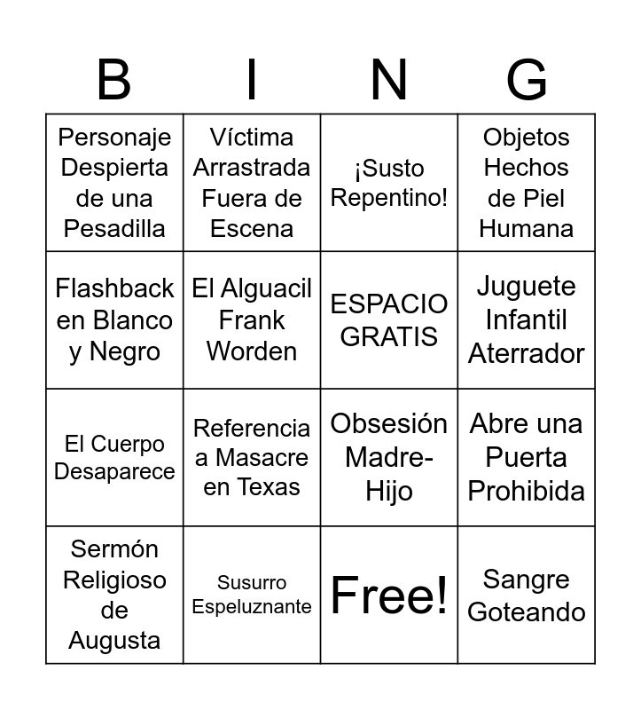 This bingo card has 17 words: Free!, Sermón Religioso de Augusta, ¡Susto Repentino!, Personaje Despierta de una Pesadilla, Referencia a Masacre en Texas, Objetos Hechos de Piel Humana, Abre una Puerta Prohibida, ESPACIO GRATIS, Juguete Infantil Aterrador, El Alguacil Frank Worden, Susurro Espeluznante, Obsesión Madre-Hijo, Flashback en Blanco y Negro, Víctima Arrastrada Fuera de Escena, El Cuerpo Desaparece, Aparición de Alfred Hitchcock and Sangre Goteando.