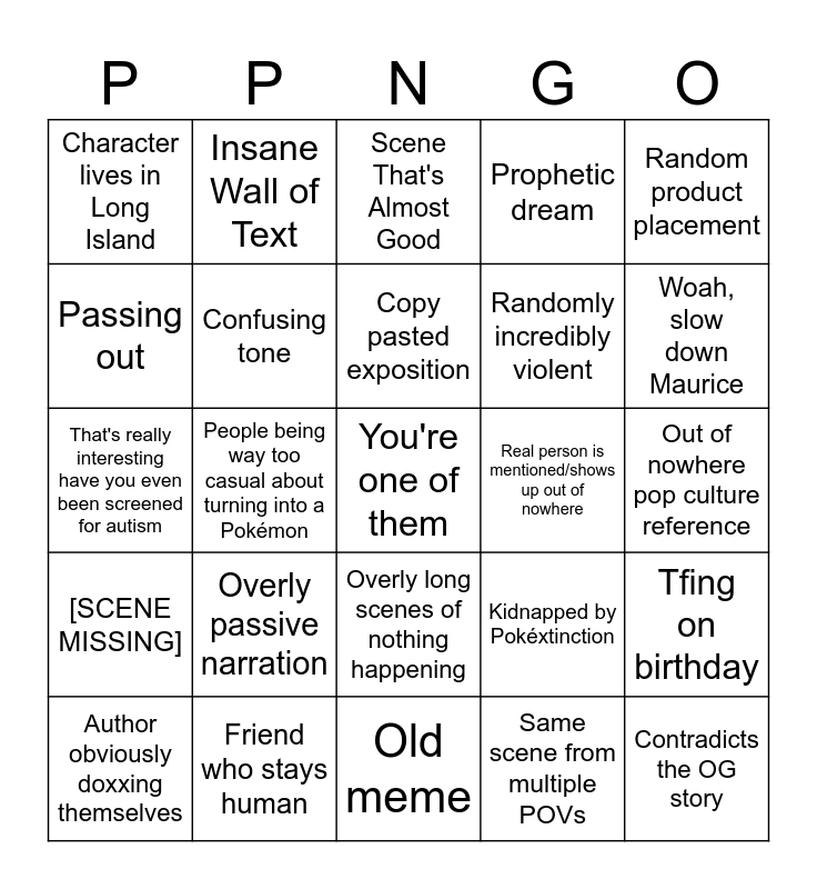 This bingo card has a free space and 30 words: Friend who stays human, Character has instant tf macguffin, People being way too casual about turning into a Pokémon, Random song lyric, Character lives in Long Island, Scene That's Almost Good, Confusing tone, Overly long scenes of nothing happening, Real person is mentioned/shows up out of nowhere, Old meme, Out of nowhere pop culture reference, Contradicts the OG story, Same scene from multiple POVs, Actually Good Joke, Woah, slow down Maurice, Pokémon Crime, Kidnapped by Pokéxtinction, [SCENE MISSING], Overly passive narration, Random product placement, That's really interesting have you even been screened for autism, Traumadumping, Insane Wall of Text, Randomly incredibly violent, Passing out, Prophetic dream, Tfing on birthday, Author obviously doxxing themselves, Copy pasted exposition and Friend is a sleeper agent.