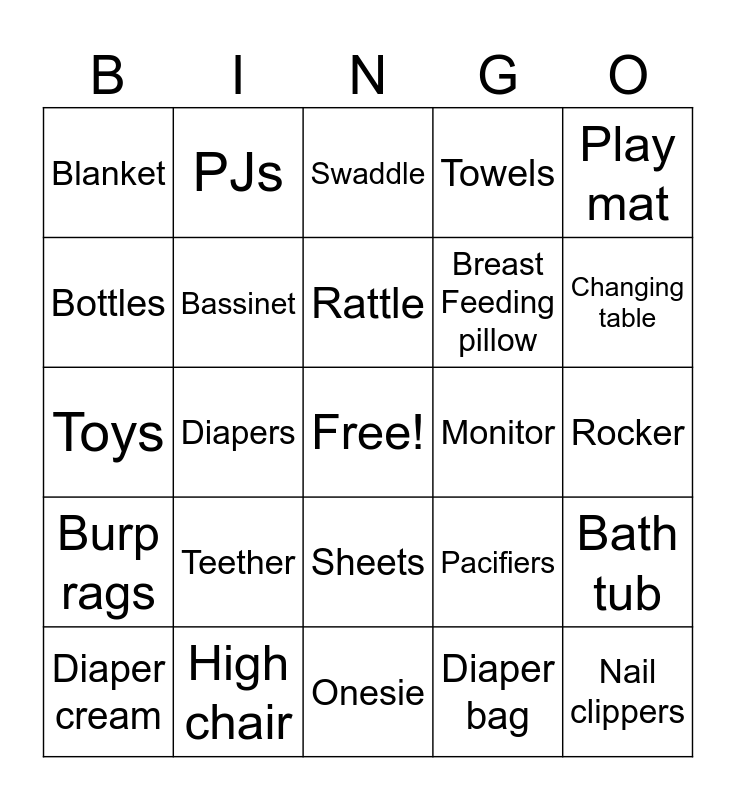 This bingo card has a free space and 30 words: High chair, Bib, Diapers, Wipes, Blanket, Swaddle, Bassinet, Sheets, Monitor, Onesie, Rocker, Nail clippers, Diaper bag, Nose sucker, Changing table, Socks, Pacifiers, Burp rags, Teether, Play mat, Toys, Books, PJs, Breast Feeding pillow, Bottles, Towels, Bath tub, Diaper cream, Rattle and Stroller.