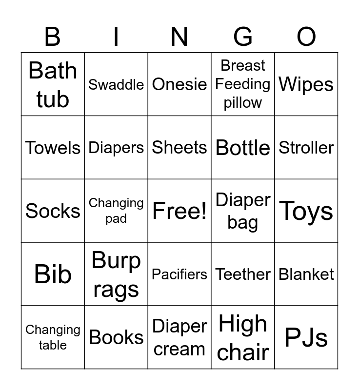 This bingo card has a free space and 32 words: High chair, Growth chart, Changing pad, Momitor, Bib, Diapers, Wipes, Blanket, Swaddle, Bassinet, Sheets, Onesie, Rocker, Nail clippers, Diaper bag, Nose sucker, Changing table, Socks, Pacifiers, Burp rags, Teether, Play mat, Toys, Books, PJs, Breast Feeding pillow, Bottle, Towels, Bath tub, Diaper cream, Rattle and Stroller.