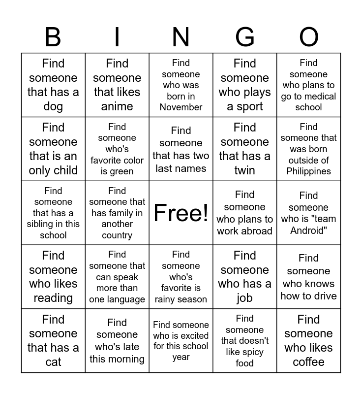 This bingo card has a free space and 24 words: Find someone that can speak more than one language, Find someone who's late this morning, Find someone that has two last names, Find someone that has a cat, Find someone who plans to go to medical school, Find someone that has a dog, Find someone that is an only child, Find someone that likes anime, Find someone who plans to work abroad, Find someone who's favorite is rainy season, Find someone that has a twin, Find someone that has a sibling in this school, Find someone who has a job, Find someone who knows how to drive, Find someone who's favorite color is green, Find someone that doesn't like spicy food, Find someone who is "team Android", Find someone who was born in November, Find someone that was born outside of Philippines, Find someone that has family in another country, Find someone who likes coffee, Find someone who likes reading, Find someone who plays a sport and Find someone who is excited for this school year.