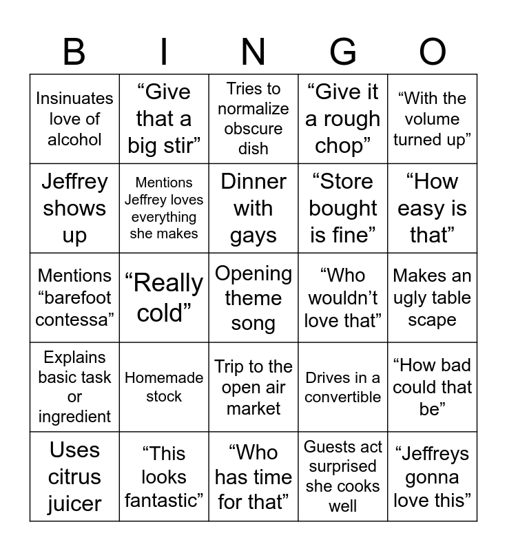 This bingo card has a free space and 24 words: Homemade stock, “This looks fantastic”, Dinner with gays, Uses citrus juicer, “With the volume turned up”, Insinuates love of alcohol, Jeffrey shows up, “Give that a big stir”, “Who wouldn’t love that”, Trip to the open air market, “Store bought is fine”, Mentions “barefoot contessa”, Drives in a convertible, “How bad could that be”, Mentions Jeffrey loves everything she makes, Guests act surprised she cooks well, Makes an ugly table scape, Tries to normalize obscure dish, “How easy is that”, “Really cold”, “Jeffreys gonna love this”, Explains basic task or ingredient, “Give it a rough chop” and “Who has time for that”.