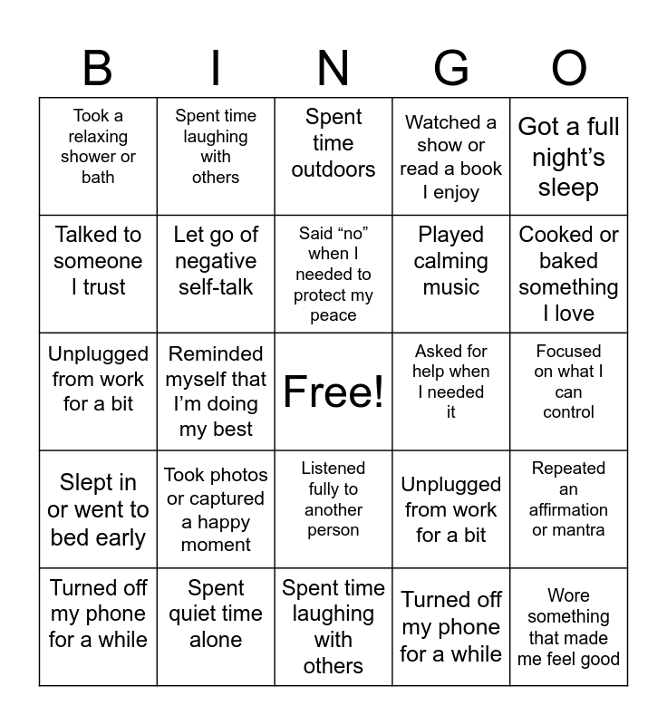 This bingo card has a free space and 24 words: Took photos or captured a happy moment, Spent quiet time alone, Said “no” when I needed to protect my peace, Turned off my phone for a while, Got a full night’s sleep, Took a relaxing shower or bath, Talked to someone I trust, Spent time laughing with others, Asked for help when I needed it, Listened fully to another person, Played calming music, Unplugged from work for a bit, Unplugged from work for a bit, Repeated an affirmation or mantra, Let go of negative self-talk, Turned off my phone for a while, Focused on what I can control, Spent time outdoors, Cooked or baked something I love, Reminded myself that I’m doing my best, Wore something that made me feel good, Slept in or went to bed early, Watched a show or read a book I enjoy and Spent time laughing with others.