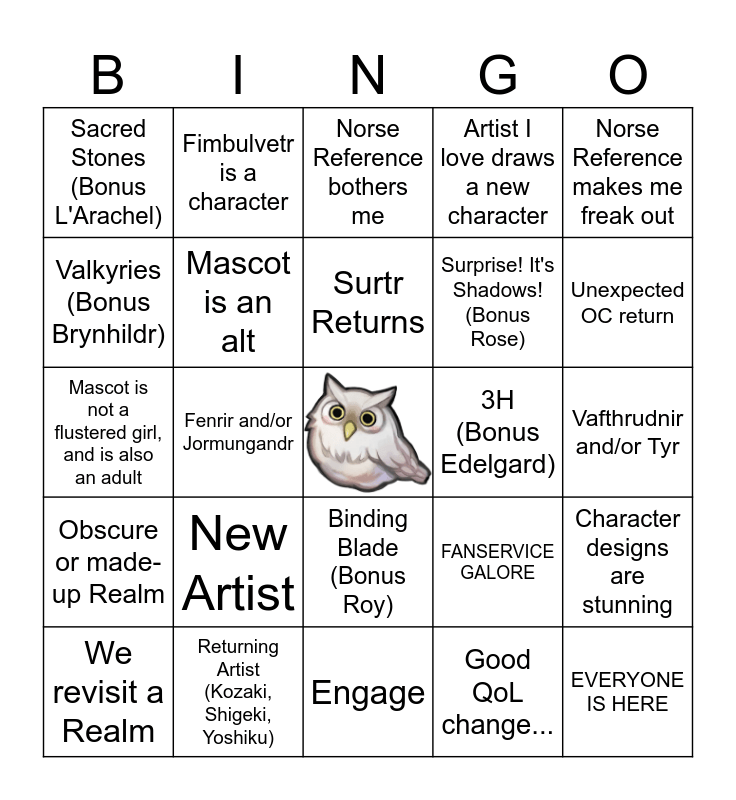 This bingo card has a free space and 24 words: New Artist, Returning Artist (Kozaki, Shigeki, Yoshiku), Surtr Returns, We revisit a Realm, Norse Reference makes me freak out, Sacred Stones (Bonus L'Arachel), Valkyries (Bonus Brynhildr), Fimbulvetr is a character, 3H (Bonus Edelgard), Binding Blade (Bonus Roy), Surprise! It's Shadows! (Bonus Rose), Mascot is not a flustered girl, and is also an adult, FANSERVICE GALORE, Character designs are stunning, Mascot is an alt, Good QoL change..., Vafthrudnir and/or Tyr, Norse Reference bothers me, Unexpected OC return, Fenrir and/or Jormungandr, EVERYONE IS HERE, Obscure or made-up Realm, Artist I love draws a new character and Engage.