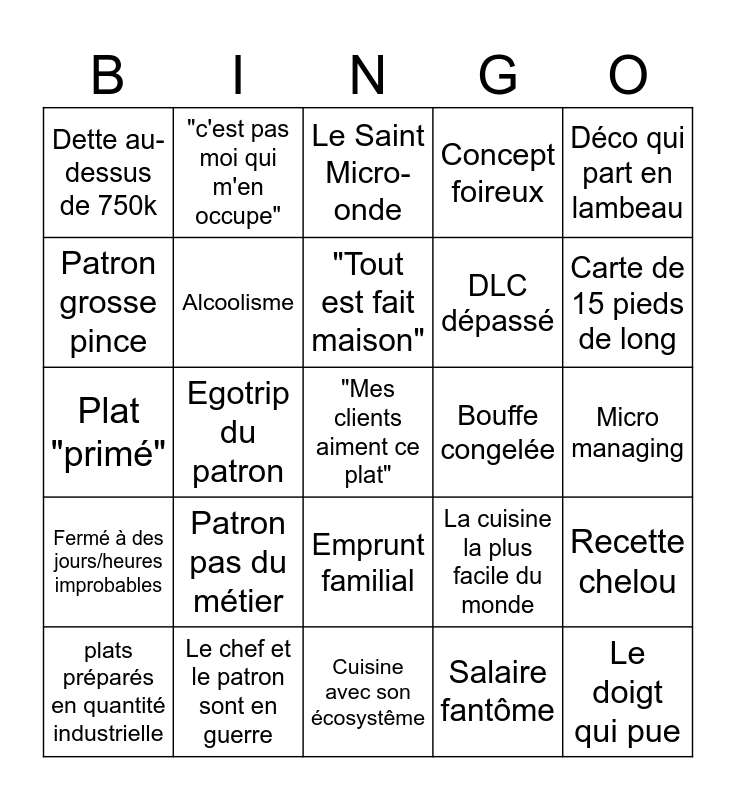 This bingo card has 25 words: Patron pas du métier, Cuisine avec son écosystême, "Tout est fait maison", plats préparés en quantité industrielle, Déco qui part en lambeau, Dette au-dessus de 750k, Patron grosse pince, "c'est pas moi qui m'en occupe", Bouffe congelée, Emprunt familial, DLC dépassé, Plat "primé", La cuisine la plus facile du monde, Recette chelou, Alcoolisme, Le doigt qui pue, Micro managing, Le Saint Micro-onde, Carte de 15 pieds de long, Egotrip du patron, "Mes clients aiment ce plat", Le chef et le patron sont en guerre, Fermé à des jours/heures improbables, Concept foireux and Salaire fantôme.