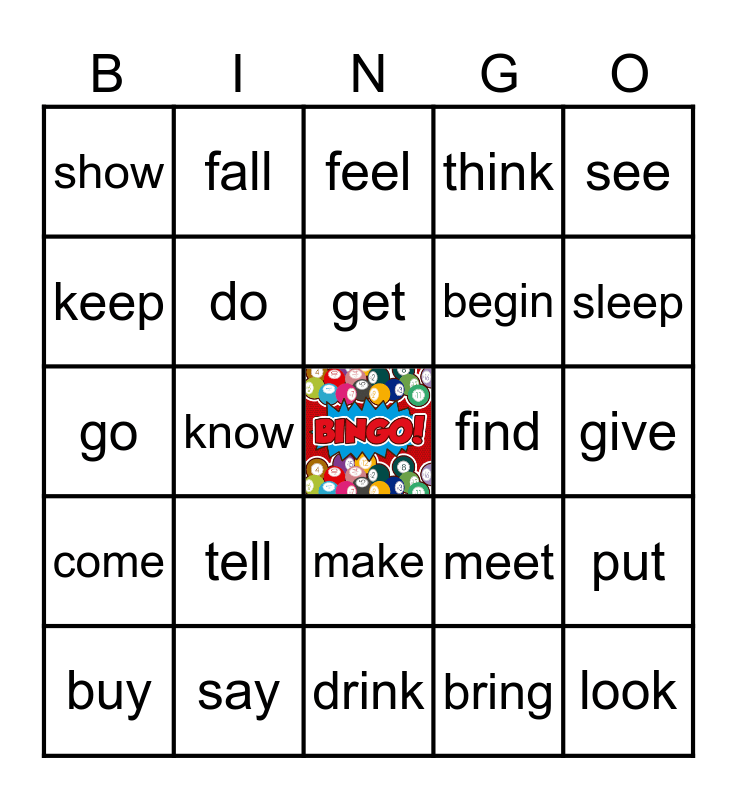 This bingo card has a free space and 40 words: be, go, have, do, say, make, get, take, see, come, know, think, look, give, find, tell, become, show, leave, feel, put, bring, begin, keep, hold, run, write, sit, speak, read, pay, buy, send, meet, sleep, drink, eat, break, fall and throw.