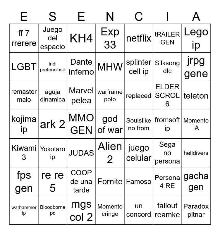 This bingo card has a free space and 48 words: Famoso, Silksong dlc, Momento cringe, ark 2, Marvel pelea, Momento IA, Juego del espacio, Bloodborne pc, tRAILER GEN, Alien 2, Lego ip, Exp 33, ELDER SCROL 6, replaced, fps gen, fromsoft ip, LGBT, jrpg gene, Persona 4 RE, netflix, splinter cell ip, MMO GEN, ff 7 rrerere, indi pretencioso, gacha gen, Dante inferno, teleton, warhammer ip, warframe poto, aguja dinamica, fallout reamke, Soulslike no from, helldivers, re re 5, kojima ip, juego celular, Sega no persona, remaster malo, JUDAS, COOP de una tarde, Kiwami 3, Paradox pitnar, KH4, mgs col 2, MHW, Fornite, Yokotaro ip and un concord.