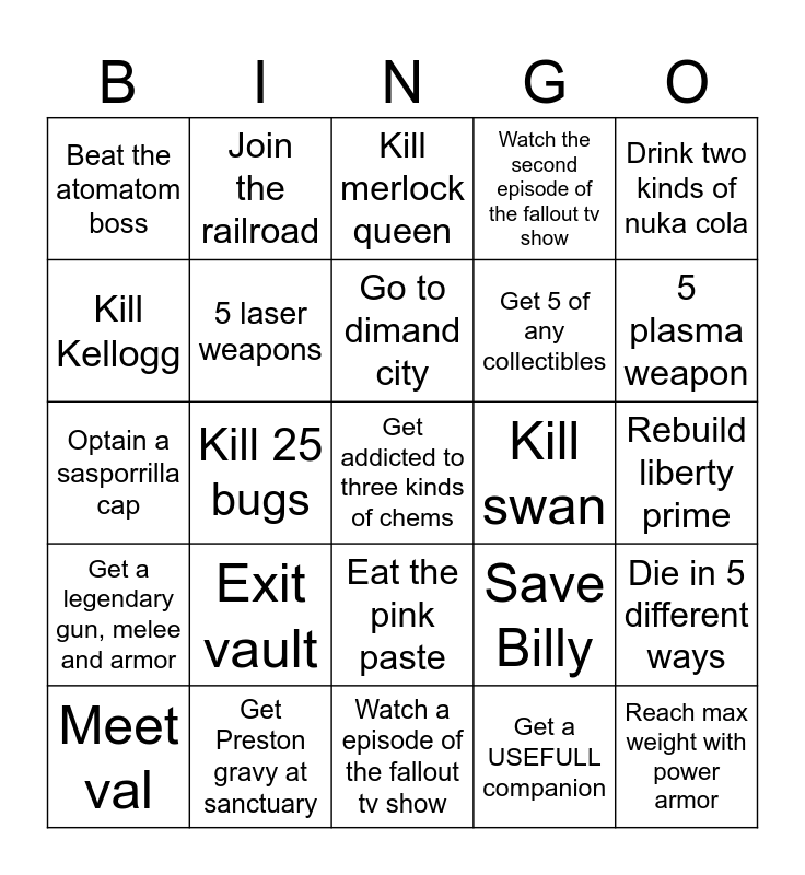 This bingo card has a free space and 24 words: Exit vault, Get Preston gravy at sanctuary, Go to dimand city, Meet val, Drink two kinds of nuka cola, Beat the atomatom boss, Kill Kellogg, Join the railroad, Kill swan, Eat the pink paste, Get 5 of any collectibles, Optain a sasporrilla cap, Save Billy, Die in 5 different ways, 5 laser weapons, Get a USEFULL companion, Rebuild liberty prime, Kill merlock queen, 5 plasma weapon, Kill 25 bugs, Reach max weight with power armor, Get a legendary gun, melee and armor, Watch the second episode of the fallout tv show and Watch a episode of the fallout tv show.